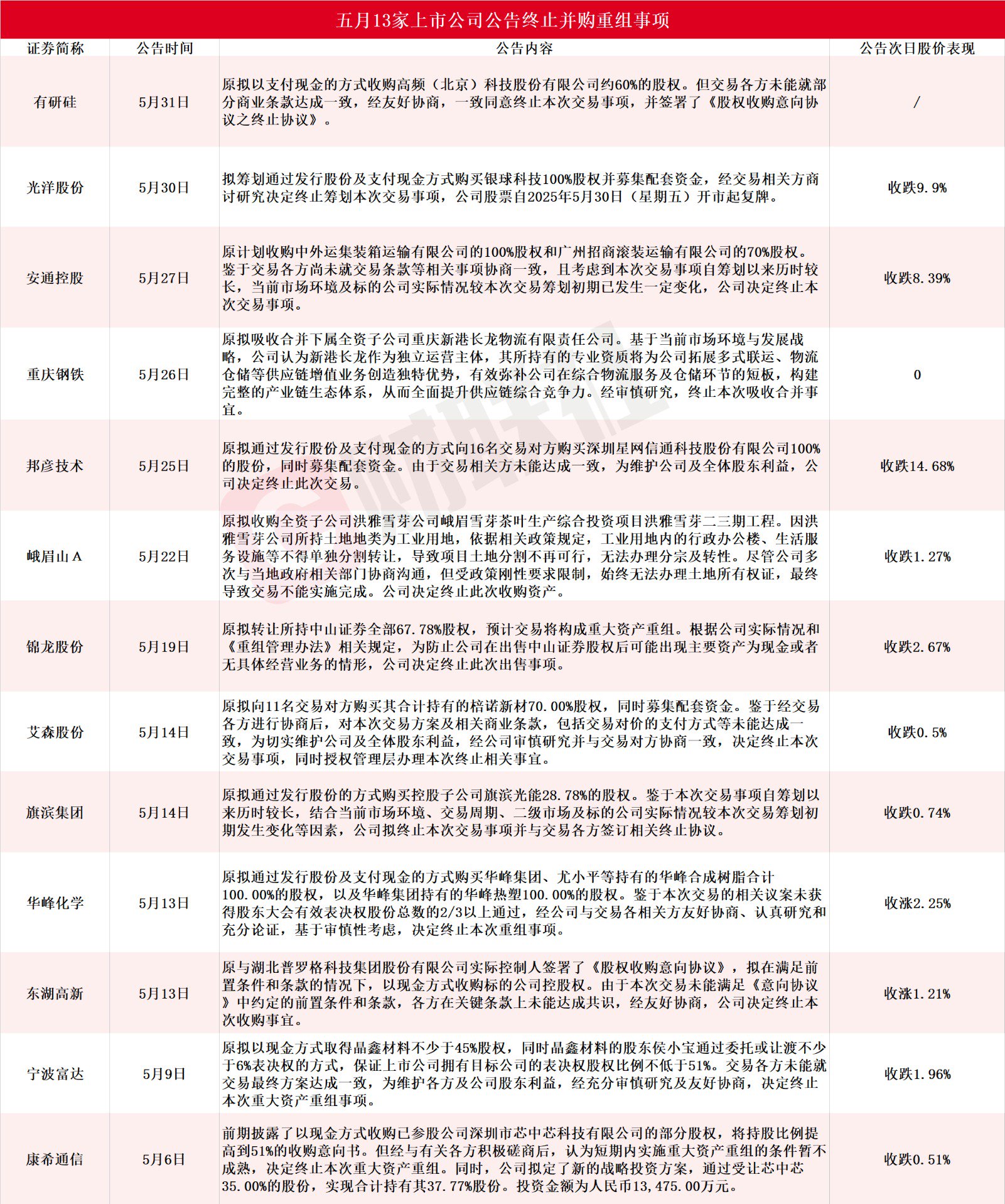据财联社不完全统计,截至发稿,五月包括有研硅、光洋股份、安通控股、重庆钢铁、邦彦技术、峨眉山A、锦龙股份、艾森股份、旗滨集团、华峰化学、东湖高新、宁波富达、康希通信在内的13家A股上市公司公告终止并购重组事项,详细情况见下图: