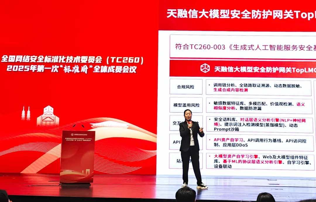 在网安标委2025年第一次全体委员会议暨“标准周”活动上,天融信科技集团董事长兼CEO李雪莹博士结合近年来天融信在大模型应用安全防护方面的实践,提出把握“快、新、全”三大原则,有效保障大模型应用安全。