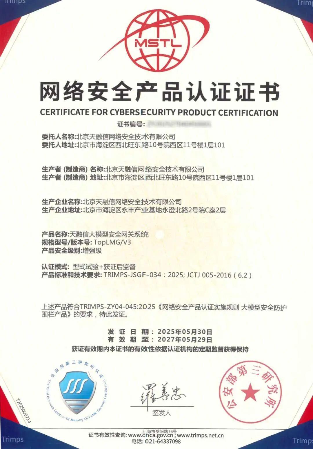 近日,天融信大模型安全网关系统(TopLMG)率先通过国家网络与信息系统安全产品质量检验检测中心(公安部第三研究所)测试,获首张《大模型安全防护围栏产品认证(增强级)》证书。