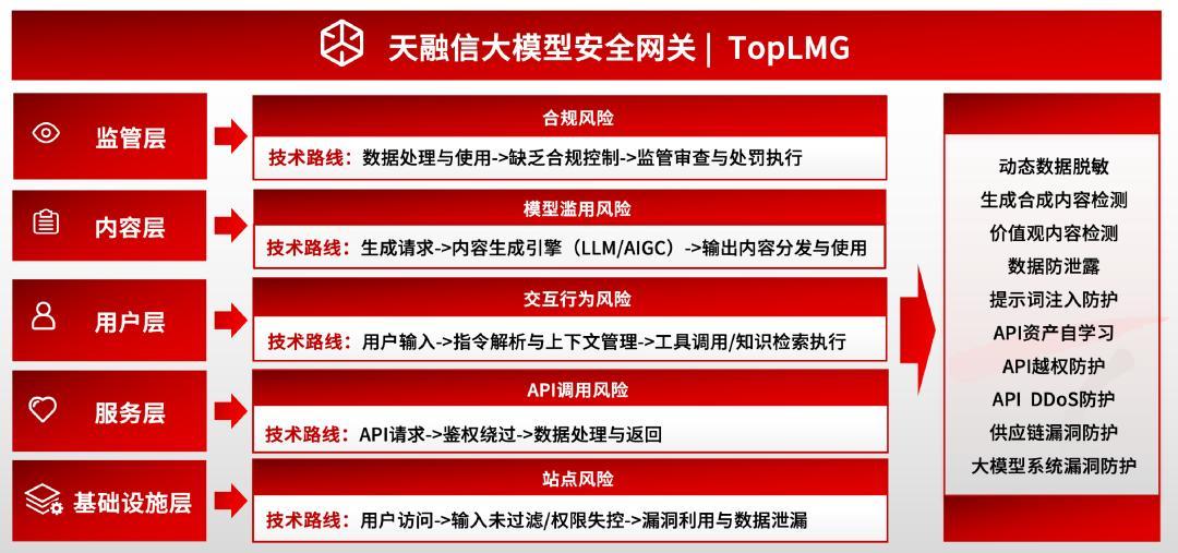 天融信依托对大模型自身安全风险和应用安全风险的深度研究,融合专项防护与通用安全技术,基于《OWASP Top 10 for LLMs》《生成式人工智能服务安全基本要求 TC260 - 003》等行业标准,提出针对大模型基础设施层、服务层、用户层、内容层、监管层的多层级安全防护体系,并自主研发天融信大模型安全网关系统(TopLMG),为企业级大模型服务构建全方位的安全防护屏障。
