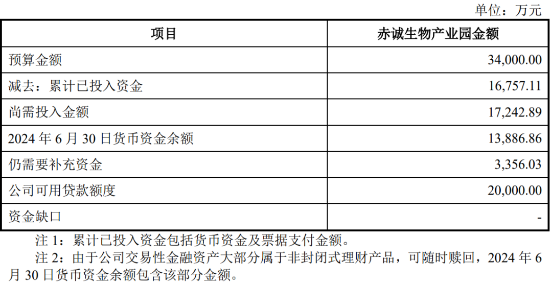 截至2024年6月30日,壬二酸车间已经基本完工,目前已经投入资金超过预算金额且后续无需较大投入,下表仅列示赤诚生物产业园项目的未来拟投入资金及资金缺口情况: