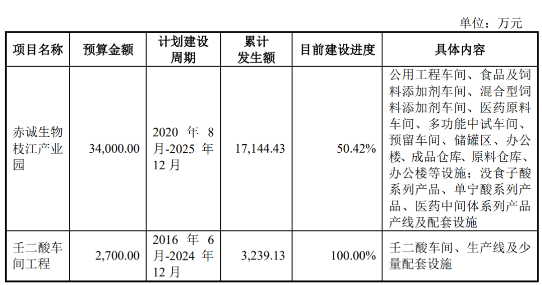 截至2024年6月30日,公司主要项目赤诚生物产业园、壬二酸车间工程的具体内容、目前建设进度、累计发生额情况如下表所示: