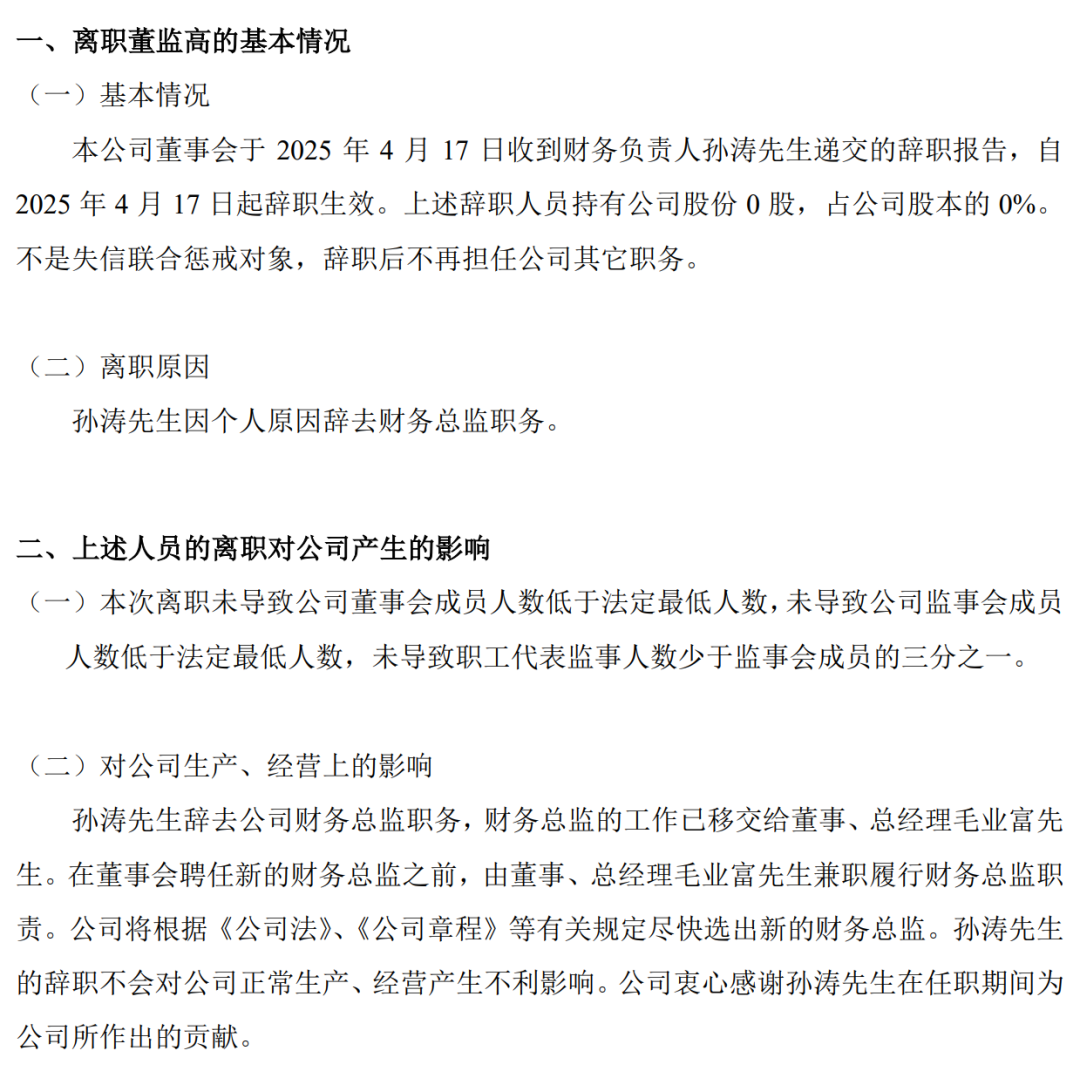 更值得注意的是,2025年4月期间,公司财务负责人已选择辞去财务总监职务。