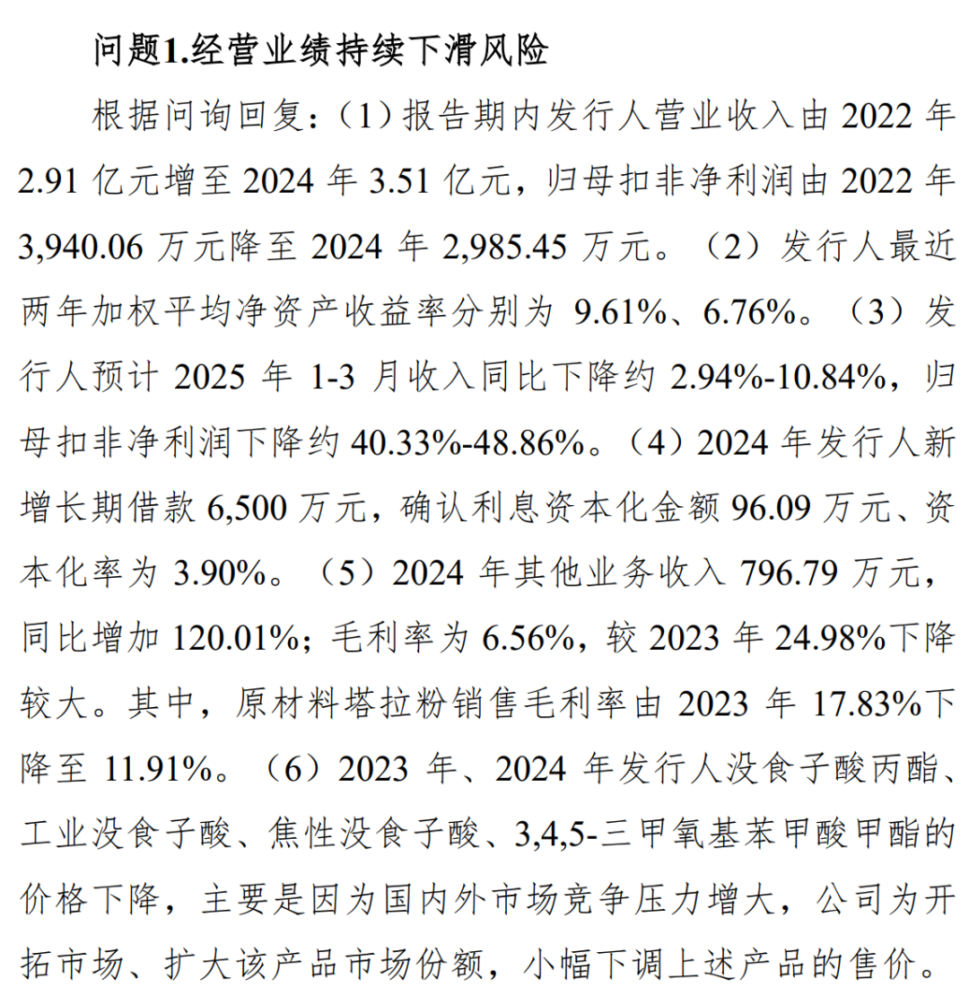 根据问询回复:(1)报告期内发行人营业收入由2022年2.91亿元增至2024年3.51亿元,归母扣非净利润由2022年3,940.06万元降至2024年2,985.45万元。(2)发行人最近两年加权平均净资产收益率分别为9.61%、6.76%。(3)发行人预计2025年1-3月收入同比下降约2.94%-10.84%,归母扣非净利润下降约40.33%-48.86%。(4)2024年发行人新增长期借款6,500万元,确认利息资本化金额96.09万元、资本化率为3.90%。(5)2024年其他业务收入796.79万元,同比增加120.01%;毛利率为6.56%,较2023年24.98%下降较大。其中,原材料塔拉粉销售毛利率由2023年17.83%下降至11.91%。(6)2023年、2024年发行人没食子酸丙酯、工业没食子酸、焦性没食子酸、3,4,5-三甲氧基苯甲酸甲酯的价格下降,主要是因为国内外市场竞争压力增大,公司为开拓市场、扩大该产品市场份额,小幅下调上述产品的售价。