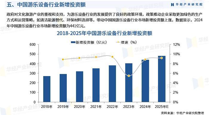 政府对文化旅游产业的重视和支持,为游乐设备行业的发展提供了良好的政策环境,政策推动企业采取更加绿色的生产方式和运营策略,如清洁能源替代、环保材料选择等,带动中国国游乐设备行业市场新增投资额上涨,数据显示,2024年中国游乐设备行业市场新增投资额为441亿元。