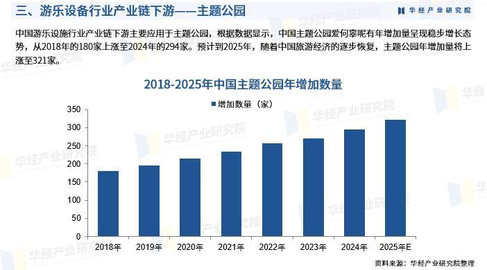 中国游乐设施行业产业链下游主要应用于主题公园,根据数据显示,中国主题公园爱何辜呢有年增加量呈现稳步增长态势,从2018年的180家上涨至2024年的294家。预计到2025年,随着中国旅游经济的逐步恢复,主题公园年增加量将上涨至321家。