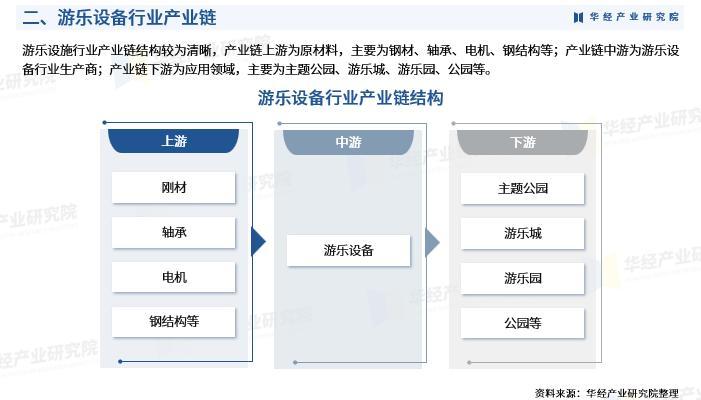 游乐设施行业产业链结构较为清晰,产业链上游为原材料,主要为钢材、轴承、电机、钢结构等;产业链中游为游乐设备行业生产商;产业链下游为应用领域,主要为主题公园、游乐城、游乐园、公园等。