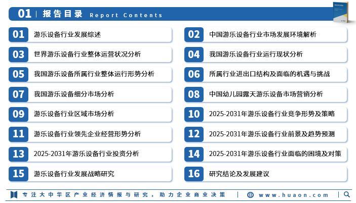 华经产业研究院为助力企业、科研、投资机构等单位了解游乐设备行业发展态势及未来趋势,特重磅推出《2025-2031年中国游乐设备行业发展运行现状及投资潜力预测报告》,本报告由华经产业研究院研究团队对游乐设备行业进行多年跟踪研究,使用桌面研究与定量调查、定性分析相结合的方式,全面解读游乐设备行业市场,深度挖掘行业潜在商机;科学运用研究模型,多维度对行业投资风险进行评估后精心研究编制。