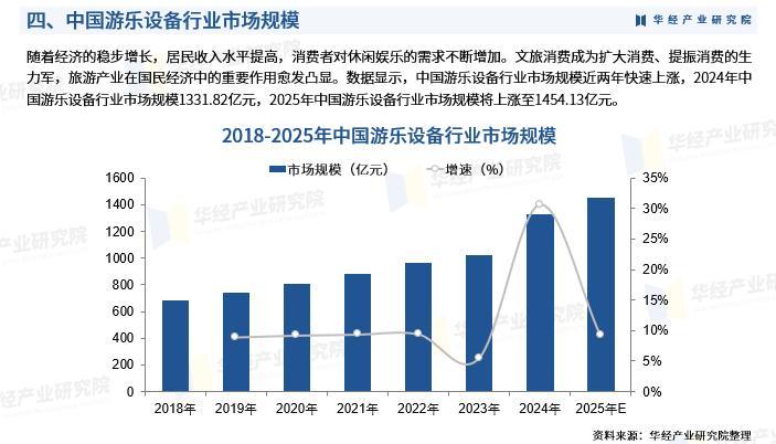 随着经济的稳步增长,居民收入水平提高,消费者对休闲娱乐的需求不断增加。文旅消费成为扩大消费、提振消费的生力军,旅游产业在国民经济中的重要作用愈发凸显。数据显示,中国游乐设备行业市场规模近两年快速上涨,2024年中国游乐设备行业市场规模1331.82亿元,2025年中国游乐设备行业市场规模将上涨至1454.13亿元。