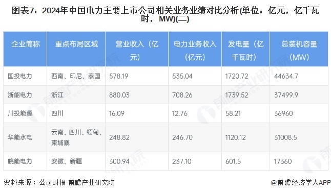 在区域布局方面,华能国际、国投电力、华能水电等企业布局较为广泛,涉及境内和境外市场。2024年营业收入、电力业务收入、发电量、总装机容量最大的均为华能国际,4项指标分别达到2455.51亿元、2375.54亿元、4798.64亿千瓦时、145125MW。