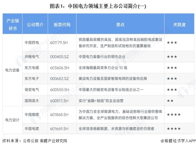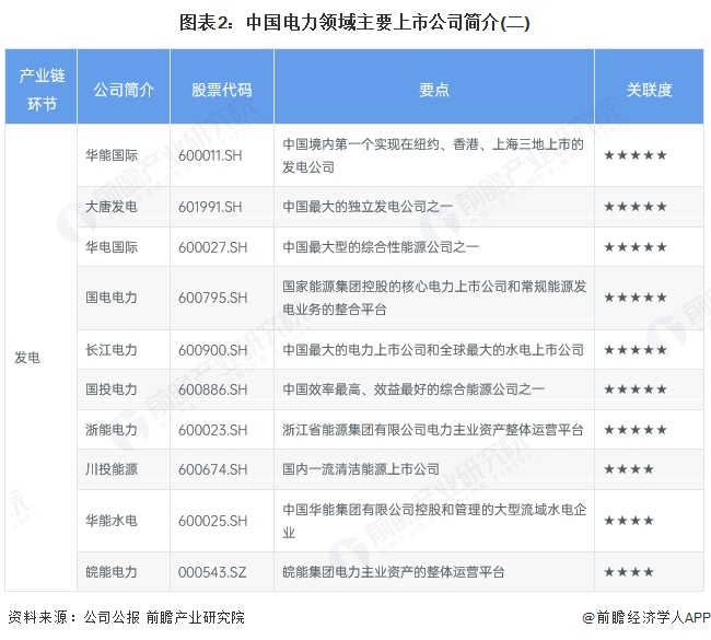 电力是国家重要的公共事业之一,目前产业内涉及的上市公司主要分布在上游电力设备和电力设计环节,与中游的发电环节。其中,涉及发电环节的代表性上市公司有华能国际、大唐发电、华电国际、国电电力、中国电力、浙能电力等。产业链上市企业汇总如下: