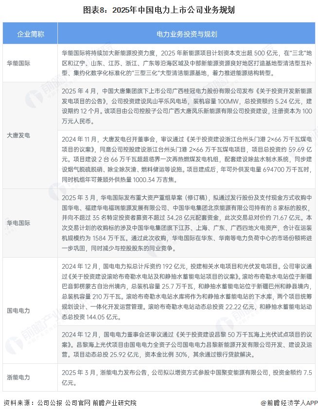 从2025年各企业最新投资布局来看,我国电力企业未来将加速向新能源转型,华能国际等加大新能源投资,建设大型清洁能源基地;大唐发电等在发展新能源的同时推进传统能源清洁高效利用;华电国际通过重组整合优化布局;国电电力注重水电与新能源融合开发;浙能电力探索聚变能源等前沿技术。整体呈现出加大新能源投入、推动传统能源升级、强化资源整合协同、探索新技术等多维度发展趋势,助力能源结构清洁低碳转型与行业高质量发展。