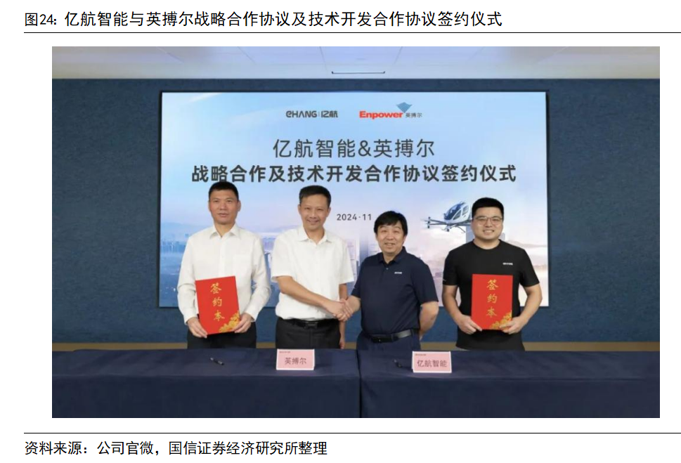 电驱动系统方面,亿航智能与英搏尔达成战略合作,开发先进eVTOL集成式电驱动系统。2024年11月11日,亿航智能与中国领先的新能源汽车动力系统供应商英搏尔达成长期战略合作及技术开发合作,致力于共同开发适用于亿航智能eVTOL系列产品的高性能电机及电机控制器产品,从而实现轻量化、高功率、强散热性的一体集成设计。双方合作重点围绕定制化开发满足亿航智能各类eVTOL产品指标并符合民航局严格适航要求的电驱动系统。英搏尔创新的“集成芯”技术将有助于进一步优化亿航智能eVTOL的电机解决方案,从而实现轻量化、高功率、强散热性的一体集成设计,并且适用于亿航智能多种eVTOL产品。这一战略举措致力于提升亿航智能 eVTOL 系列产品的性能和可靠性,满足行业持续发展的需求。