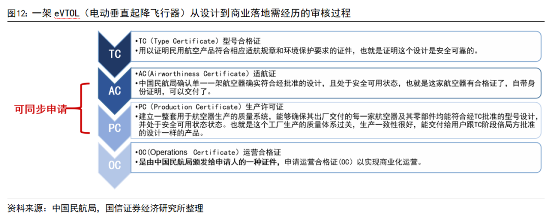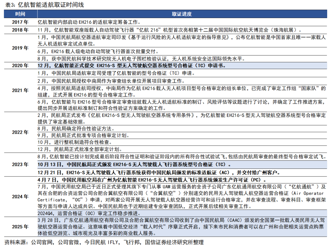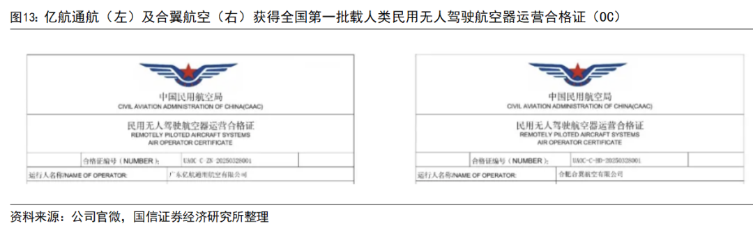 运营合格证(OC)方面,从取证角度看,亿航智能EH216-S相关运营航司获得运营合格证(OC),低空经济从试点迈向商业化运营阶段。2025年3月28日,广东亿航通用航空有限公司及合肥合翼航空有限公司收到了由中国民航局(CAAC)颁发的全国第一批载人类民用无人驾驶航空器运营合格证。这意味着中国低空经济“载人时代”序章正式开启,接下来市民和消费者可以在广州和合肥相关运营点购票体验低空游览、城市观光及丰富多彩的商业载人服务。未来,运营商并将根据运营情况合法合规逐步开拓城市通勤等其他更多场景。首批OC的颁发,创造了低空经济、城市空中交通的新里程碑,也让新质生产力释放出更加强大的活力。此前,亿航智能的EH216-S无人驾驶载人航空器已获得了全球首个载人eVTOL产品型号合格证(TC)、标准适航证(AC)、生产许可证(PC),此次亿航通航及合翼航空取得运营合格证(OC),也让亿航智能成为全球第一“四证集齐”企业,标志着低空载人服务及未来城市空中交通可以正式开启商业化进程,逐步走向大众消费的普及阶段。