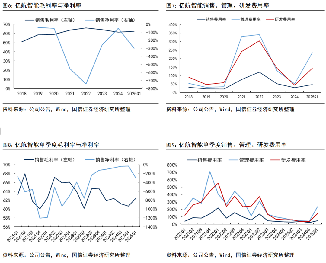 2025Q1,亿航智能的毛利率/净利率分别为62.4%/-300.4%,分别同比变动+0.6/-197.8pct,分别环比变动+1.8/-271.9pct。2025Q1,公司毛利率同环比增长,主要系EH216系列产品的平均售价提高。
