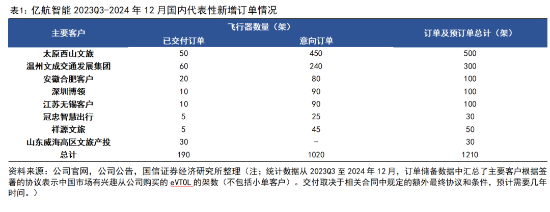 从订单角度看,根据统计,目前EH216系列产品订单累计在手订单超过1500架。2023Q3至2024年12月,公司取得适航认证(TC)后,国内新增采购订单及预订单数量超过1,200架。