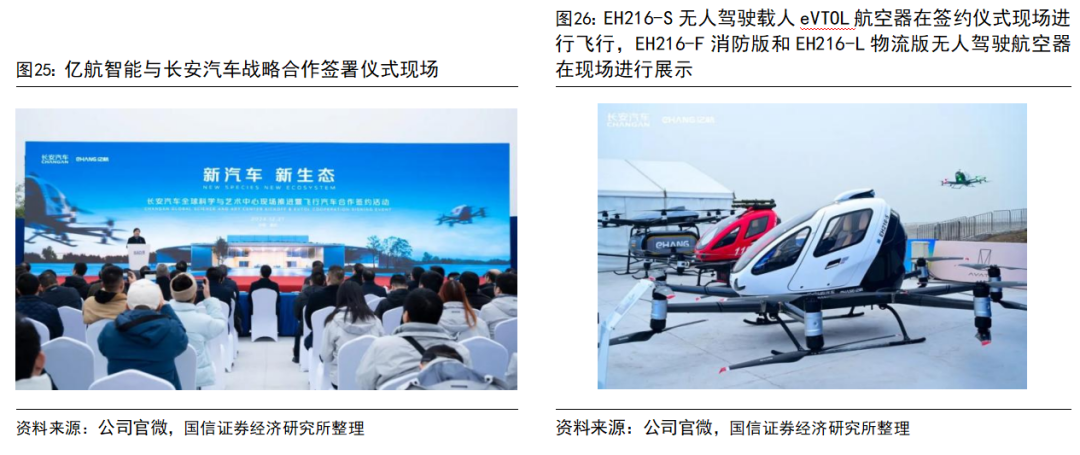 亿航智能与长安汽车合作,共同开发飞行汽车相关产品,拓展亿航智能的产品线,面向大众消费市场。2024年12月21日,亿航智能与长安汽车签订战略合作协议,双方将围绕飞行汽车(含电动垂直起降航空器“eVTOL”和狭义的陆空两栖飞行汽车,以下简称“飞行汽车”)的研发、制造、销售和运营等项目,依托于亿航智能在飞行器领域的强大产品研发能力和低空飞行管理技术解决方案,结合长安汽车在车辆领域雄厚的生产制造基础和完善丰富的市场资源,探索成立未来出行生态科技合资公司,共同推动低空经济和新型立体交通行业生态的大发展。双方的跨界战略合作将进一步丰富及拓宽亿航智能的eVTOL产品线,打开未来潜在面向广阔C端客群的飞行汽车市场。根据合作协议,双方将发挥各自特色优势资源,合力研发具有科技含量、符合未来发展、具备市场竞争力的飞行汽车产品及其配套,并在研发、制造、市场推广、渠道拓展、用户体验和售后维修等方面进行深度合作,布局低空经济的应用场景,推动飞行汽车及亿航无人驾驶载人eVTOL产品在大众消费领域的商业化进程,促进先进新型立体交通行业的创新发展。