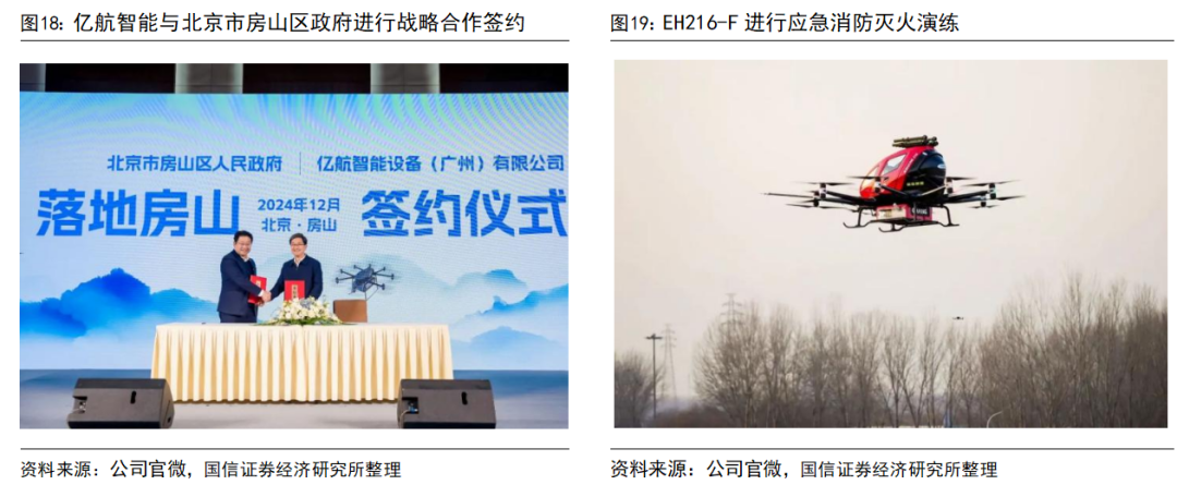 4)华北北京低空应急救援装备全国总部:公司与北京房山区政府达成合作,打造综合型应急消防产业园。2024年12月,亿航智能与北京市房山区人民政府达成战略合作协议。双方将针对低空应急救援领域,在北京市房山区形成“一总部、多场景、全产业”的顶层布局,合力将其打造成为低空应急救援产业集聚区和新技术、新产品、新场景试点示范区,构建“低空+应急”行业生态新模式。根据协议,亿航智能将在北京市房山区设立低空应急救援装备全国总部,并计划合作运营应急救援板块业务。房山区政府将积极协助产业资金支持总部落地和相关项目建设。