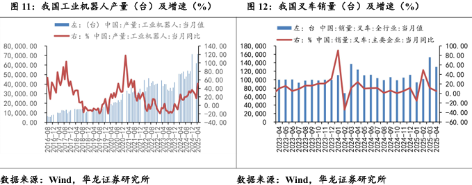 2025年4月,我国工业机器人产量71547台,同比增加51.5%;2025 年4月,我国叉车销量130109台,同比增加5.03%。