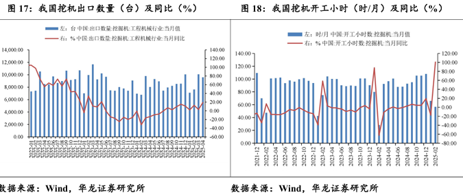 2025年4月,我国挖机出口9595台,同比增长19.3%;2025年3月, 我国挖机出口10073台,同比增长2.87%。2025年2月我国挖掘机开工小 时数为56.8时/月,同比增长100.7%,开工复苏明显。