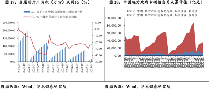 2025年4月,我国房地产新开工面积累计17835.84万平方米,同比下 降23.8%;2025年4月地方政府专项债当月发行5526亿元,1-4月份累计 发行29845亿元,同比增长133.11%。