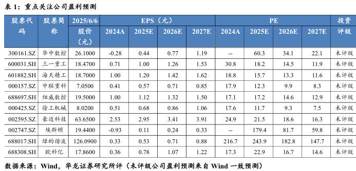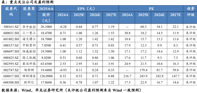 制造业PMI环比提升,关注弱复苏中结构性机会。2025年5月, 我国制造业PMI49.5%,环比+0.5pct。生产指数、新订单指数均 出现回升,在多项政策综合效应下,企业预期趋向改善,生产经 营活动有回暖迹象。工业母机是通用设备的主要品种,受政策支 持、宏观经济影响较大。我们认为,在扩大内需背景下,政府有 望加大“两新”、“两重”项目支持力度,为机床工具行业带来 更多的增量需求,可逢低左侧布局顺周期复苏板块。建议关注:华中数控(300161.SZ)、纽威数控(688697.SH)、海天精工 (601882.SH)、豪迈科技(002595.SZ)、欧科亿(688308.SH) 等。