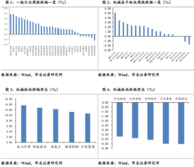 重点覆盖个股中,涨幅前五的公司分别为冰山冷热(+13.65%)、联 赢激光(+12.78%)、迪威尔(+12.24%)、海得控制(+11.21%)、今创 集团(+10.67%);跌幅前五的公司分别为斯菱股份(-4.54%)、兰石重 装(-4.51%)、宏华数科(-4.07%)、兰剑智能(-3.89%)、杰克股份(-3.72%)。