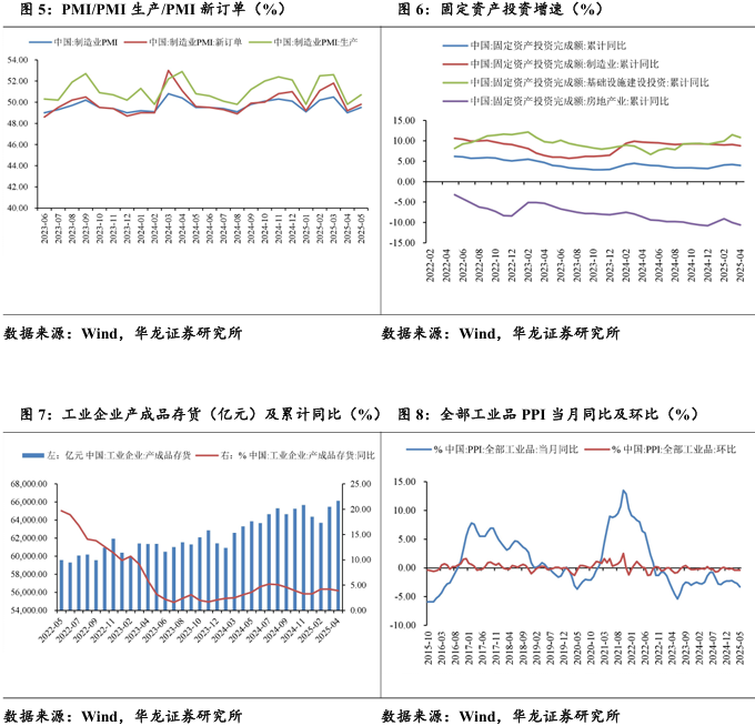 截至2025年5月,我国制造业PMI49.5%,同比持平,环比+0.5pct;制造业新订单PMI49.8%,同比+0.2pct,环比+0.6pct;制造业生产PMI50.7%, 同比—0.1pct,环比+0.9pct。 截至2025年4月,固定资产投资完成额累计值同比增加4%,其中制 造业投资同比增加8.8%,基建投资同比增加10.85%,房地产投资完成额同比下降10.6%。 截至2025年4月,我国工业企业产成品存货66144.1亿元,同比增加 3.9%;截至2025年5月,我国全部工业品PPI同比下降3.3%,环比下降 0.4%。