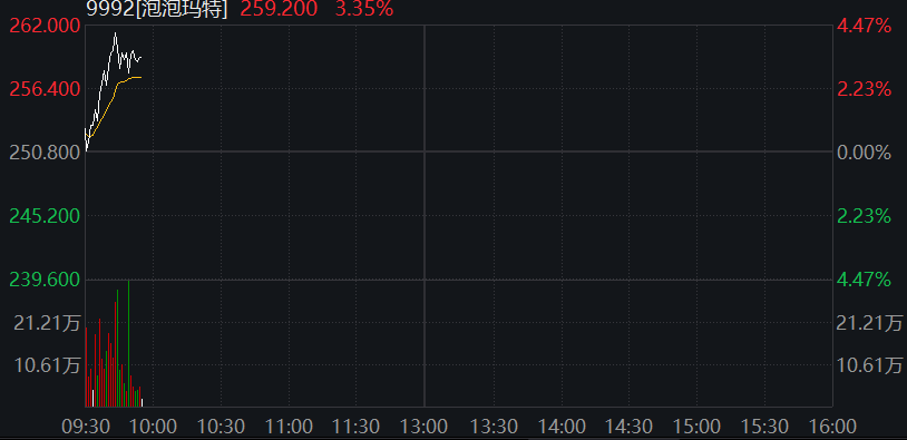 新消费三宝走势分化,泡泡玛特盘中再创新高,涨超3%。蜜雪集团调整,现跌超3%。