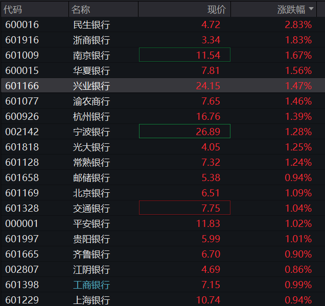 银行股继续走强,兴业银行股价创历史新高,民生银行、南京银行、长沙银行创阶段新高,华夏银行、宁波银行、浙商银行等跟涨。