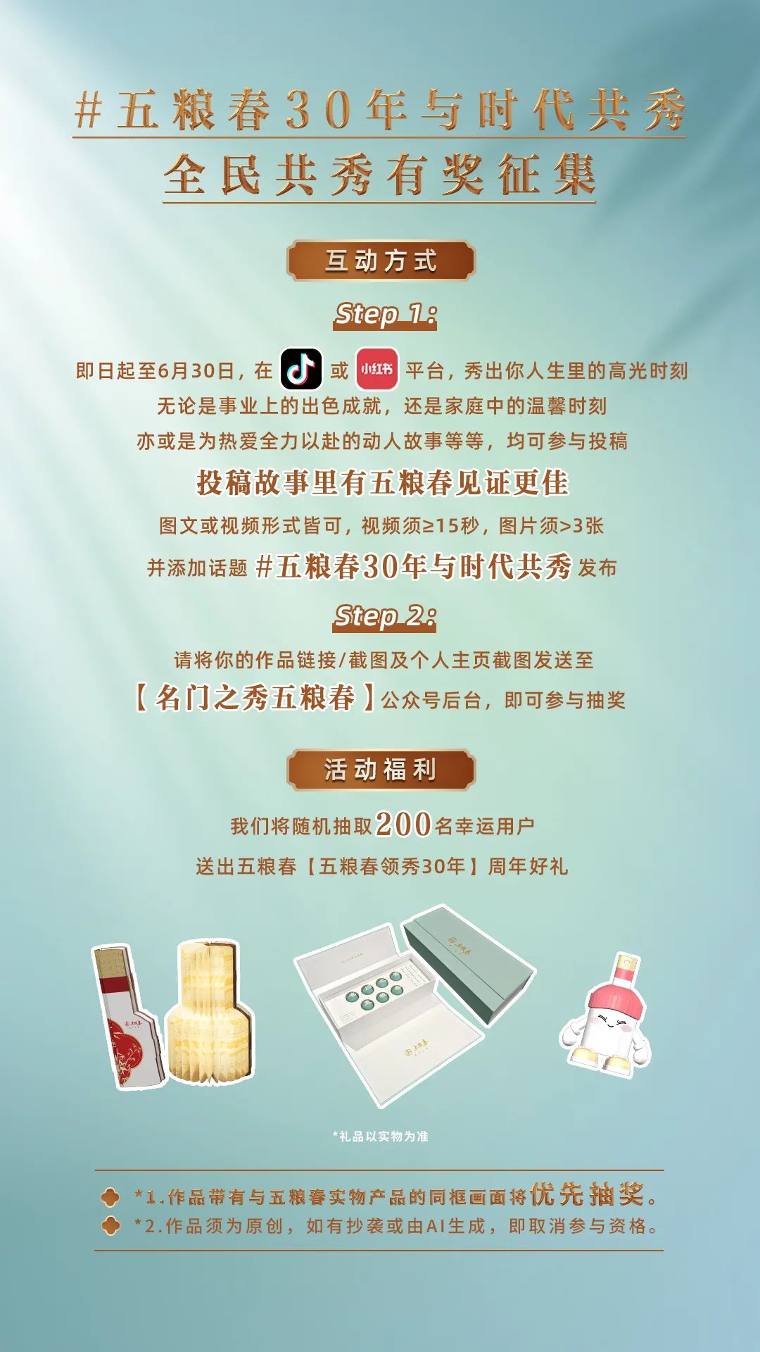 温馨提示:为庆祝五粮春品牌成立30周年,一场“全民共秀有奖征集活动”正火热进行。6月30日前,只要在抖音、小红书秀出你的人生高光时刻,并将相关内容发至“名门之秀五粮春”公众号后台即可参与抽奖,一起行动起来吧!
