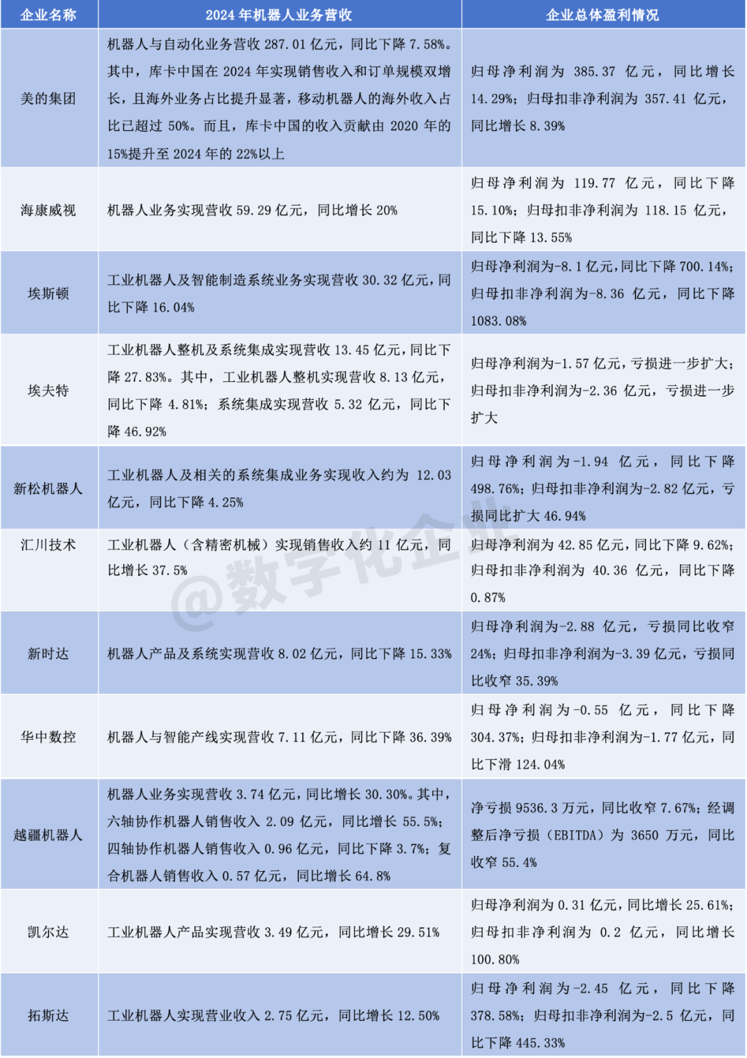 2024年,在市场需求波动、竞争格局呈现白热化、成本居高不下以及盲目产能扩张和多元化布局等多重因素的影响下,多家工业机器人本体厂商出现巨额亏损。例如,埃斯顿全年实现销售收入40.09亿元,同比下降13.83%;归母净利润为-8.1亿元,同比下降700.14%;归母扣非净利润为-8.36亿元,同比下降1083.08%。其中,工业机器人及智能制造系统业务实现营收30.32亿元,同比下降16.04%,成为拖累整体经营业绩的主要因素。此外,埃夫特、新松机器人、拓斯达、越疆机器人、华中数控等上市企业也都出现亏损,亏损金额从数千万元到数亿元不等。