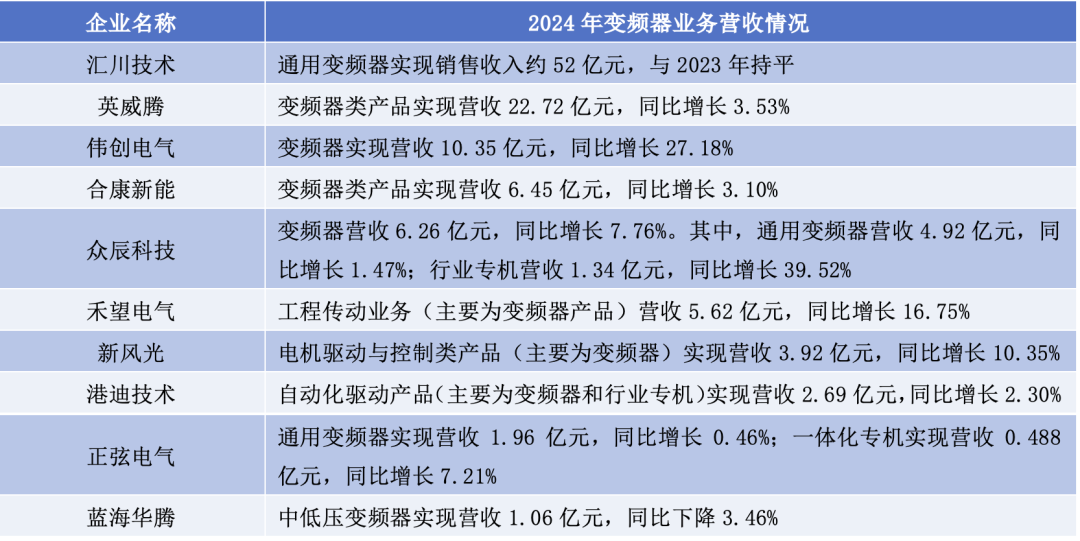 2024年,除蓝海华腾的变频器业务营收出现下滑外,主要上市企业的变频器业务营收均实现增长,但增长曲线差异化明显。其中,伟创电气、禾望电气增长势头强劲,变频器业务营收分别增长27.18%和16.75%。英威腾、蓝海华腾、合康新能、正弦电气、港迪技术、众辰科技等的增长率均在10%以下,增长较为乏力。汇川技术作为头部企业,通用变频器销售收入与2023年持平,面临市场份额进一步突破的挑战。