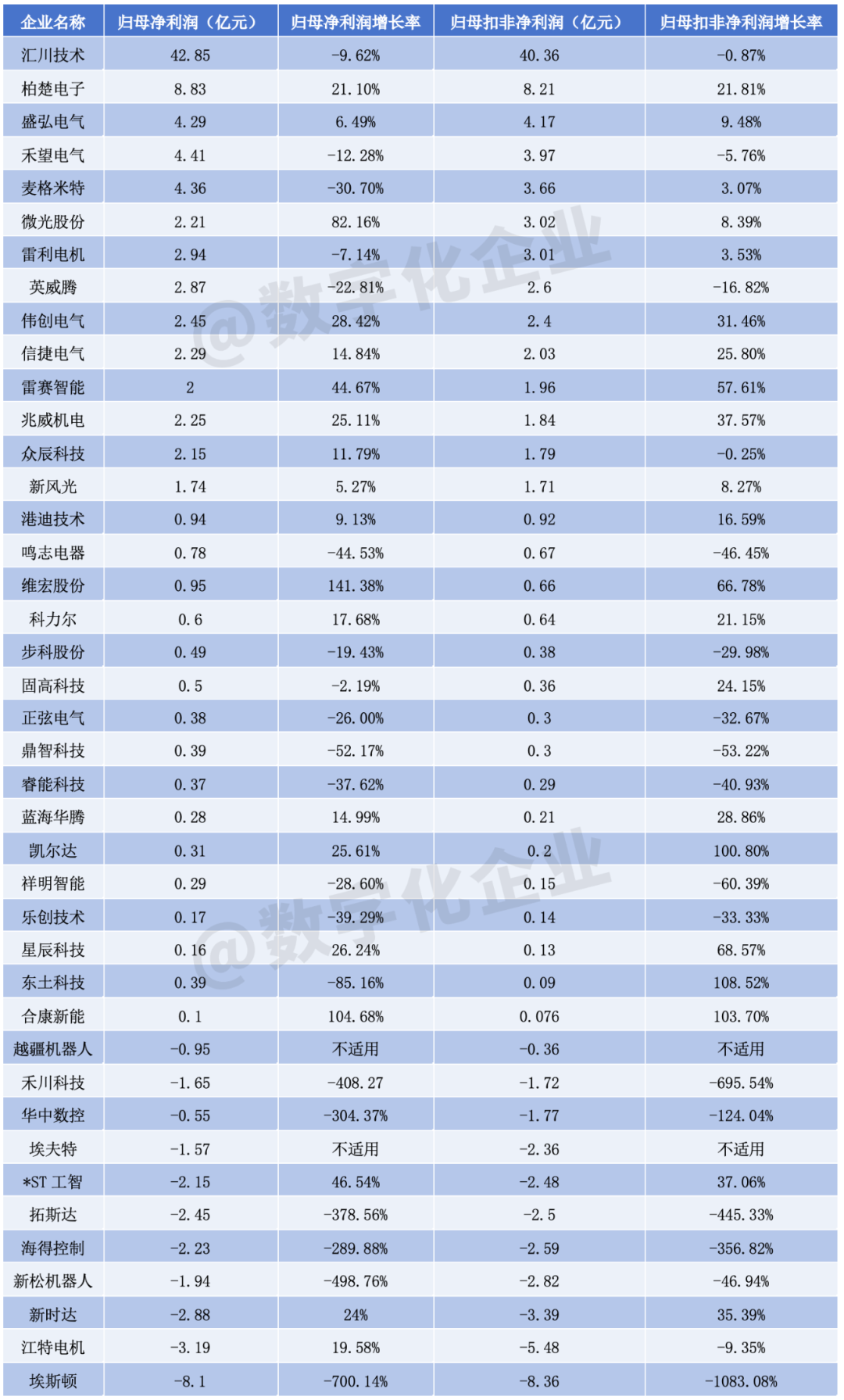 从归母扣非净利润来看,41家上市企业中(因美的集团和海康威视的工业自动化业务为非核心业务,未纳入统计),30家实现盈利,11家上市企业出现亏损,两极分化明显。例如,凯尔达、合康新能、东土科技的归母扣非净利润增速均超过100%;埃斯顿、禾川科技、拓斯达等扣非净利润严重下滑。其中,埃斯顿2024年归母扣非净利润为-8.36亿元,同比骤降1083.08%。