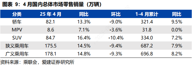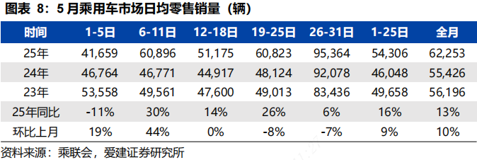 5月第5周乘用车市场日均零售9.5万辆,同比+6%,环比-7%。5月,全国乘用车市场零售193万辆,同比+13%,环比+10%;2025年以来累计零售880.2万辆,同比+9%。