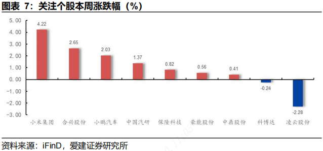 小米集团(+4.22%)、合兴股份(+2.65%)、小鹏汽车(+2.03%)、中国汽研(+1.37%)、保隆科技(+0.82%)、豪能股份(+0.56%)、中鼎股份(+0.41%)、科博达(-0.24%)、凌云股份(-2.28%)。