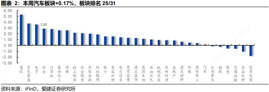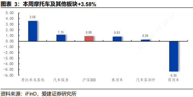 本周汽车板块跑输沪深300指数0.71个pct。本周申万汽车板块报收6,982.4点,上涨0.17%,板块排名25/31,同期沪深300指数报收3,874.0点,上涨0.88%。子板块方面,摩托车及其他板块+3.58%;汽车服务板块+1.15%;乘用车板块+0.83%;汽车零部件板块+0.28%;商用车板块-5.35%。