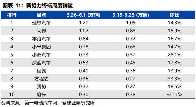 ■ 5月乘用车销量同环比上涨。国内乘用车市场5月26-31日第5周日均零售9.5万辆,同比+6%,环比-7%;5月累计零售193万辆,同比+13%,环比+10%。5月26-31日新势力周度销量前五位:理想汽车1.20万辆,问界1.02万辆,零跑汽车0.84万辆,小米集团0.78万辆,小鹏汽车0.73万辆。