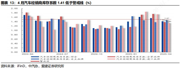 4月综合库存系数1.41低于警戒线,环比下降。4月上旬受北方农忙及南方部分地区风俗性大宗消费延迟影响,车市表现平淡;下旬,多地出台新一轮扩内需促消费政策,叠加上海国际车展密集发布新车,带动客流量提升及订单转化率环比增长。4月,汽车经销商综合库存系数1.41,同/环比分别-17.1%/-9.6%;合资品牌库存系数1.37,同/环比分别-24.3%/-21.7%;自主品牌库存系数1.47,同/环比分别-12.0%/+7.3%;高端豪华&进口品牌库存系数1.33,同/环比分别-17.9%/-23.1%。