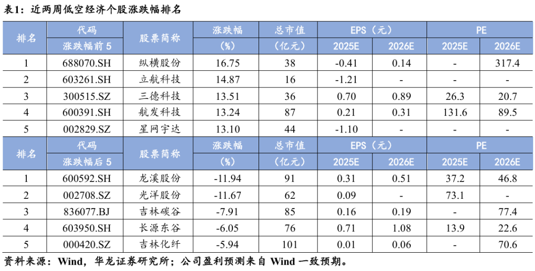 市场表现:近两周低空经济指数的涨跌幅为3.71%,同期万得全A涨跌幅1.59%,沪深300涨跌幅-0.21%。涨幅排名前五的股票分别为纵横股份(+16.75%)、立航科技(+14.87%)、三德科技(+13.51%)、航发科技(+13.24%)、星网宇达(+13.10%)。