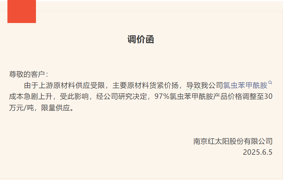 2025年6月5日,红太阳股份发布产品调价函,称由于上游原材料供应受限,主要原材料货紧价扬,导致公司氯虫苯甲酰胺成本急剧上升,受此影响,经公司研究决定,97%氯虫苯甲酰胺产品价格调整至30万元/吨,限量供应。
