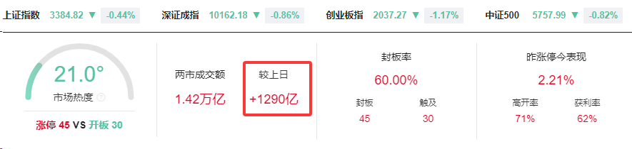 创业板指放量下跌1.17% 两市下跌个股超4000只 AI概念全线走低。三大指数午后集体下行均以下跌报收,截至收盘,沪指跌0.44%,深证成指跌0.86%,创业板指跌1.17%。两市个股跌多涨少,下跌个股超4000只;两市全天成交1.42万亿元,较上一日放量成交1290亿元,内资主力资金净卖出565.8亿元;两市涨跌中位数为-1.06%。