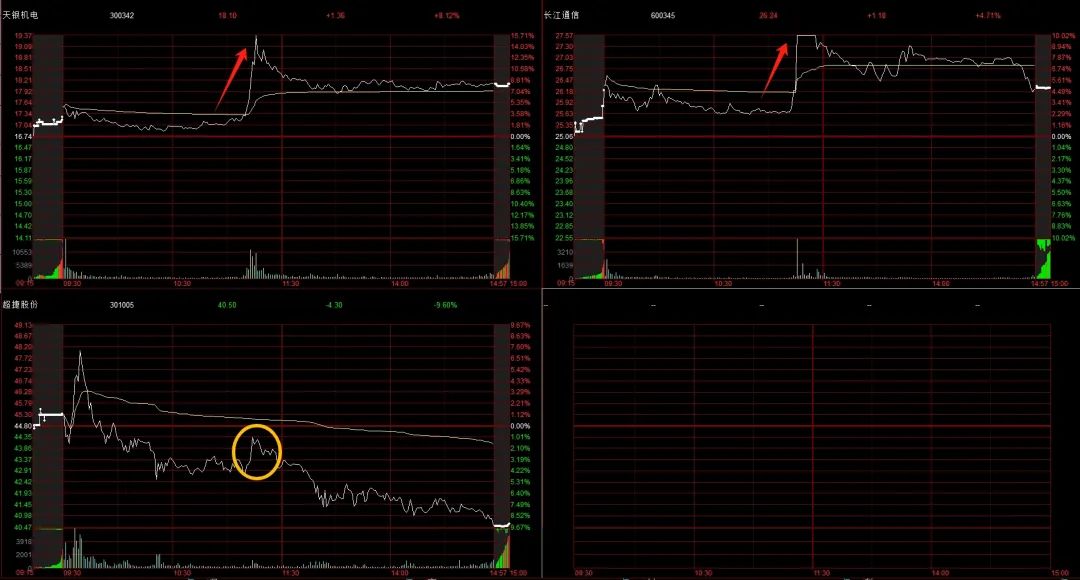 上面都是题材乱战,临近中午突然商业航天回流了一波,资金拉了天银机电,长江通信顺势上板,结果超捷股份连翻红的勇气都没有,这个题材也在下午一开盘就回落了。