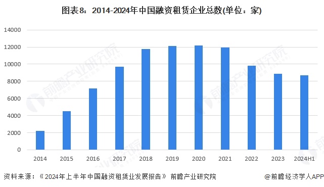 全国金融租赁企业数量和业务总量呈稳定态势。截至2024年6月底,全国融资租赁企业(不含单一项目公司、分公司、SPV子公司、港澳台当地租赁企业和收购海外的公司,包括一些地区监管部门列入失联或经营异常名单的企业、不含已正式退出市场的企业,)总数约为8671家。