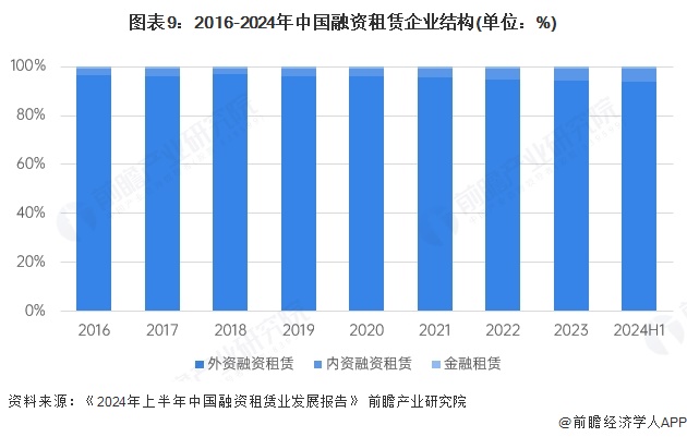 外资融资租赁企业仍是中国融资租赁行业内的主要力量,但是近年来数量占比出现小幅下降趋势,截至2024年上半年,外资融资租赁企业数量占比为93.99%。而内资融资租赁企业开始崛起,数量占比从2016年的2.86%增长至2024年6月底的5.19%。