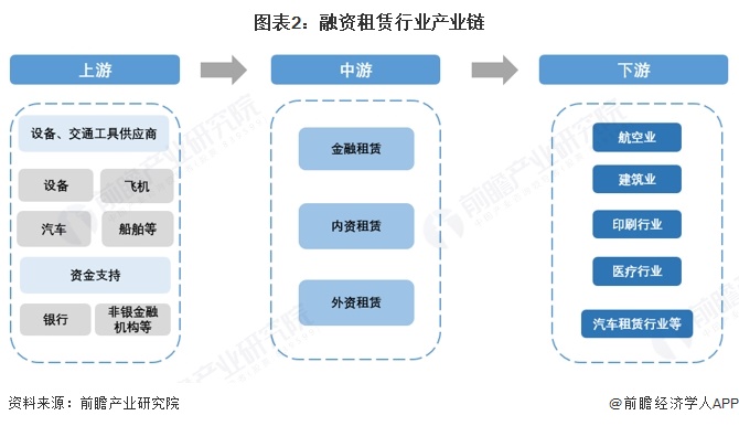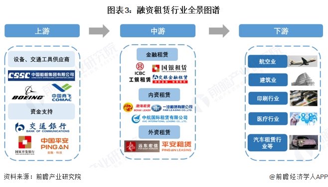 融资租赁的行业的产业链主要涉及到融资租赁业务中的三方主体,包括供应商、出租人和承租人。上游主要为供应商和提供资金支持的银行等金融机构,中游为融资租赁公司,根据公司性质分为金融租赁、内资租赁和外资租赁,下游承租人主要在航空运输、建筑、印刷、医疗、汽车租赁等行业。