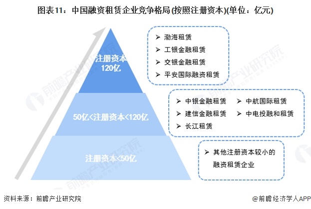 从注册资本角度看,超过120亿元的融资租赁公司数量较少,主要包括渤海租赁、工银金融租赁、交银金融租赁等,以银行、保险等股东为背景的居多。注册资本在50亿至120亿之间的融资租赁公司主要有中银金融租赁、中航国际租赁、建信金融租赁等。