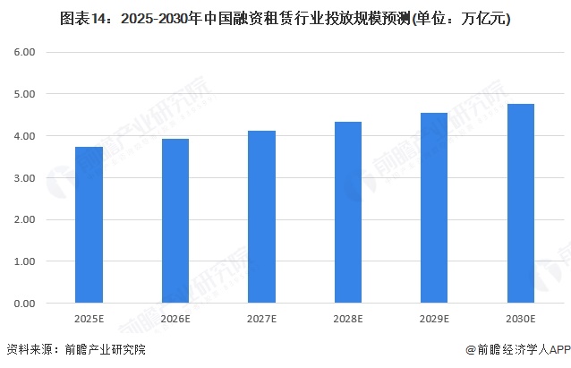 2024年以来,融资租赁行业整体发展呈现放缓态势,企业数量和合同余额延续负增长趋势,但整体市场需求依然稳定。预计未来六年,行业整体投放规模增速将继续保持缓慢增长,年均增速将维持在5%左右。