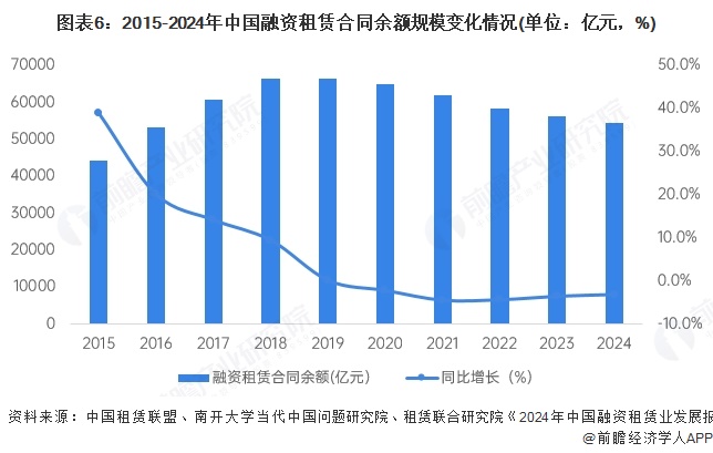 统计数据显示,2015-2018年,我国融资租赁业务总量呈现逐年增长的趋势,但是随着融资租赁业务总量基数的增加和行业监管政策的趋严,增速处于下降态势。2019年以来,全国融资租赁合同余额出现下滑。2024年底的融资租赁合同余额约为54600亿元人民币,比2023年底减少约1800亿元,降幅为3.2%。