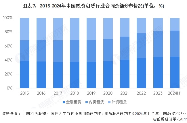 2015-2024年上半年,金融租赁始终占据我国融资租赁市场最大份额。进入2024年,北银金融租赁等增资扩股,同时,一些外资租赁公司仍退出市场,导致行业注册资金继续减少,外资租赁占比大幅下降,内资租赁占比逐年提升。截至2024年上半年,中国融资租赁行业合同余额结构中,金融租赁业务总量占全行业的43.0%;内资租赁业务总量占全行业的35.5%;外资租赁业务总量占全行业的17.3%。